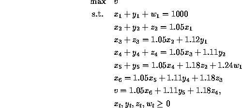 The problem is really a kind of inventory problem. In a given year, the amount of money carried forward from the previous year (in savings), plus the yield from securities that mature that year, equals the amount invested in new securities plus the amount of money left over for next year. There is one twist: inventory grows while in storage. (In real inventory problems, stock often decreases over time due to spoilage, etc., and this can be reflected in negative ``interest'' rates.) Let v be the final yield when all securities are cashed in at the end of the sixth year. Then if the objective is to maximize final yield, the LP is,